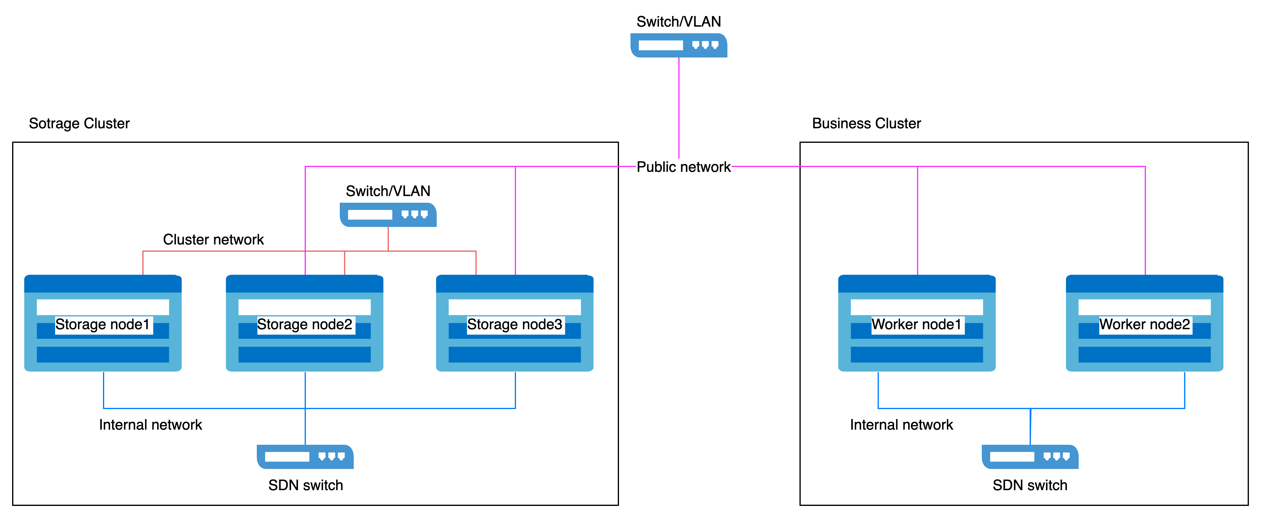 • Public Network: Used for client-to-storage component interactions (e.g., I/O requests).